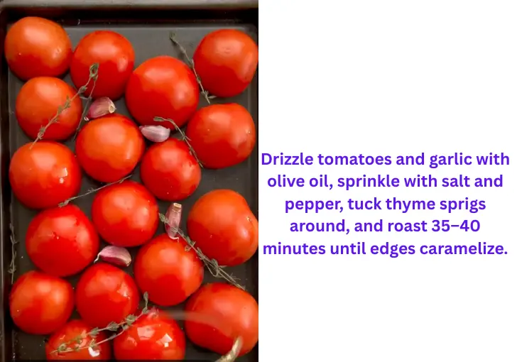 - Roast Tomatoes & Garlic: Drizzle tomatoes and garlic with olive oil, sprinkle with salt and pepper, tuck thyme sprigs around, and roast 35–40 minutes until edges caramelize.