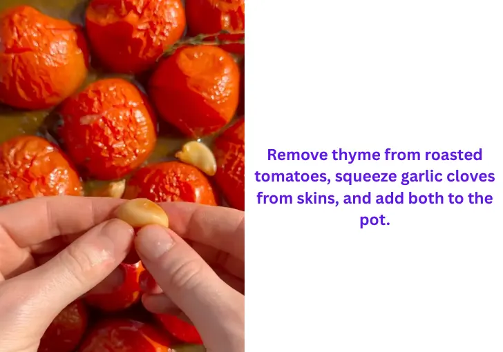 - Add Roasted Tomatoes & Garlic: Remove thyme from roasted tomatoes, squeeze garlic cloves from skins, and add both to the pot.