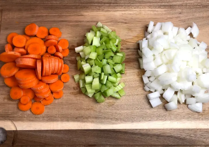 - Chop the yellow onion, celery stalks, and carrot sticks into small, even pieces. Place all chopped vegetables directly into the slow cooker.