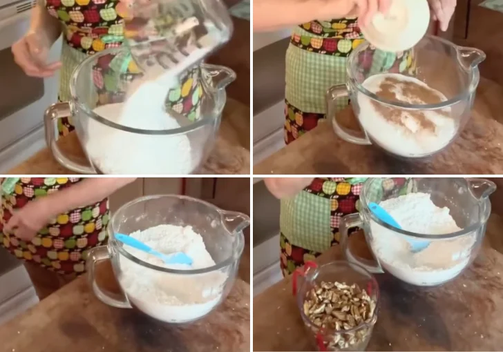 - In a large mixing bowl, add the flour, baking soda, salt, sugar, and ground cinnamon. Stir thoroughly until everything is evenly distributed. Add the chopped pecans and mix again so the nuts are well coated with the dry mixture.