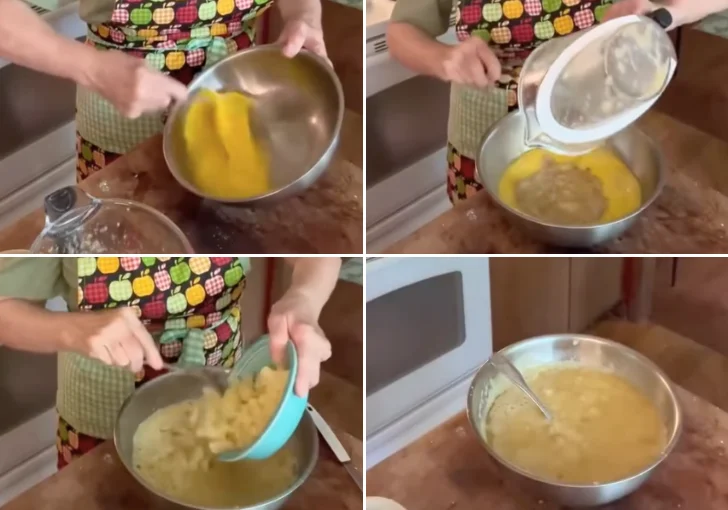 - In a separate bowl, beat the eggs until well blended. Add the mashed bananas and stir until smooth. Pour in the vegetable oil and mix until fully combined. Add the drained pineapple and vanilla extract, then stir until the mixture is evenly moistened and well blended.