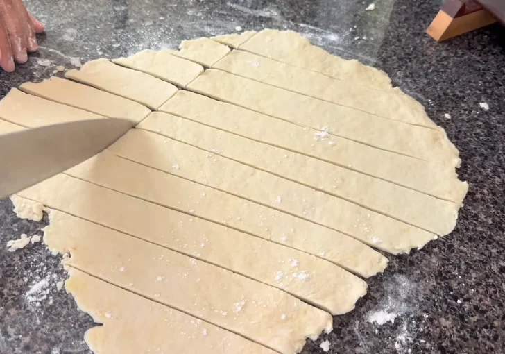- Using a knife or pizza cutter, slice the dough into strips about 1 inch wide, then cut across to form medium-length strips. The shapes do not need to be perfect.