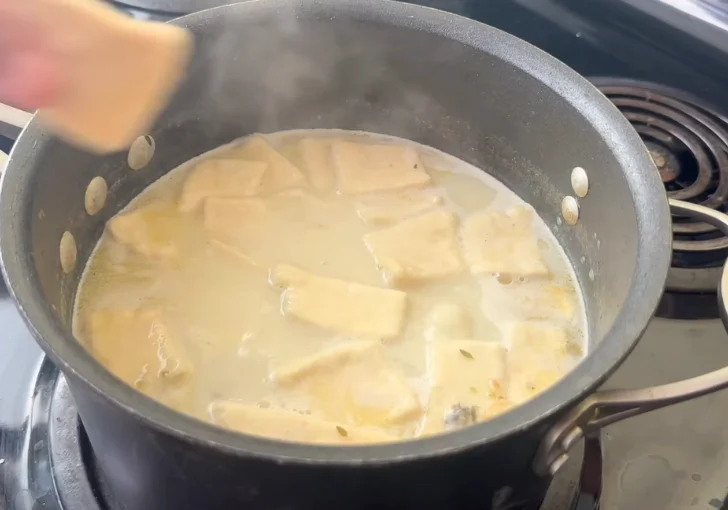 I like to drop in a few strips at a time and give a gentle stir between batches. This simple habit keeps the dumplings from clumping together and helps them cook more evenly.