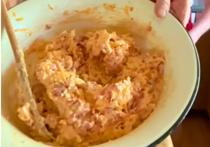Now comes the best part — mixing! Using clean hands or a large spoon, gently fold the ingredients together. Brenda prefers using her hands — it’s easier to feel when the cream cheese and cheddar are evenly blended without over-mashing.