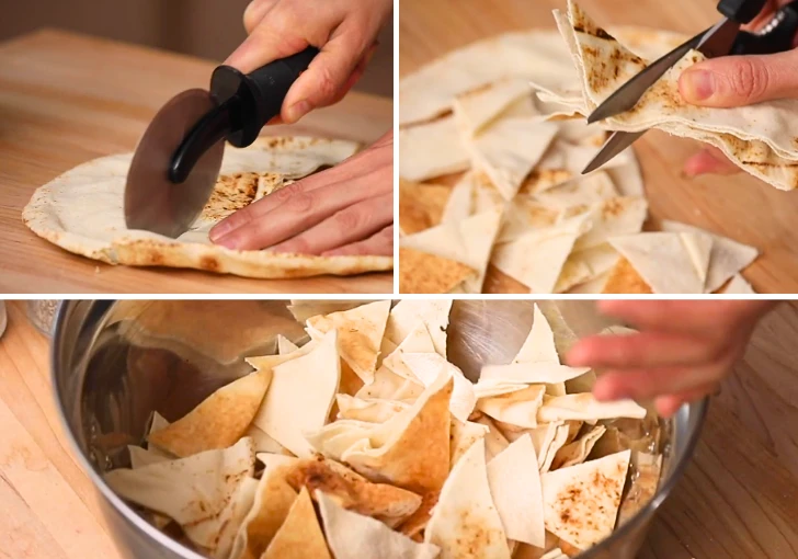 - Cut each pita loaf into small, even triangles using a pizza cutter or kitchen shears. Keep both sides of the pita together if using thin Lebanese pita, as this creates a sturdier chip after baking. If using thicker pita, peel the layers apart before cutting. Aim for uniform size so all pieces bake evenly. Slight separation is fine and does not affect the result.