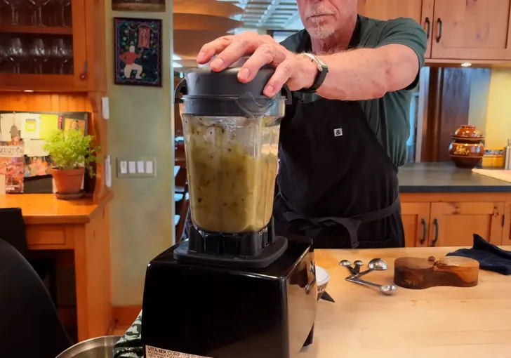 Cut the roasted onion into smaller pieces so the blender can process it evenly. Add the onion, all roasted tomatillos and their flavorful juices, peeled roasted garlic, and roasted serranos (remove stems) into the blender.