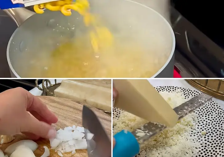 Bring a large pot of salted water to a boil. Cook 8 oz elbow macaroni until al dente (usually 1–2 minutes less than package directions). Drain and set aside. While the pasta cooks, dice the onion, mince the garlic, and grate the Gruyère and Parmesan so everything is ready to go — cheese melts fastest when room temperature.
