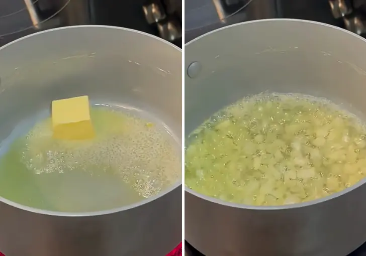 - Using the same pan the pasta was cooked in, melt the butter together with the olive oil over medium heat. Add the diced onion and minced garlic, stirring and letting them cook until softened and aromatic.