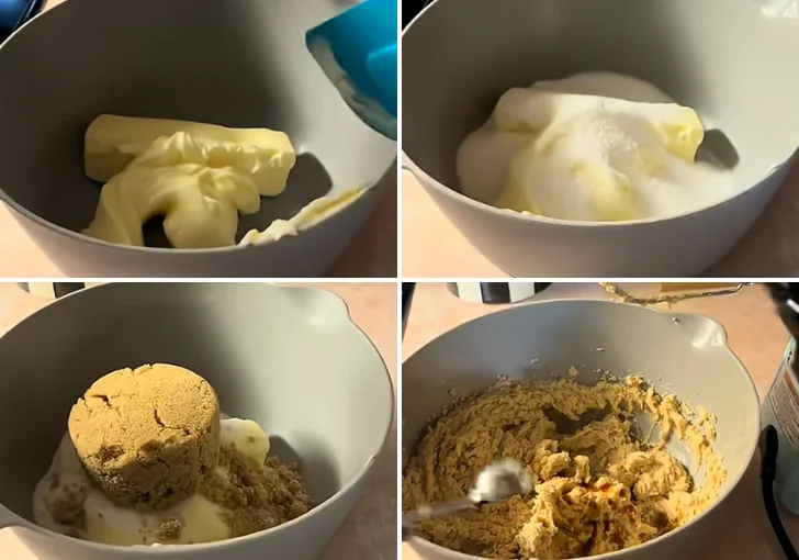 - In a separate bowl, combine the softened butter, granulated sugar, and light brown sugar. Mix thoroughly using a hand mixer until the mixture becomes smooth and well blended.