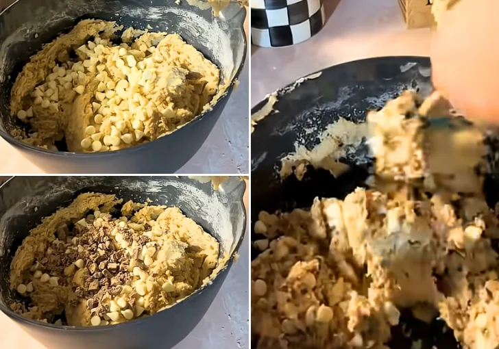 - Add the white chocolate chips, crushed toffee bar, and crushed pretzels. Mix until evenly distributed throughout the dough.