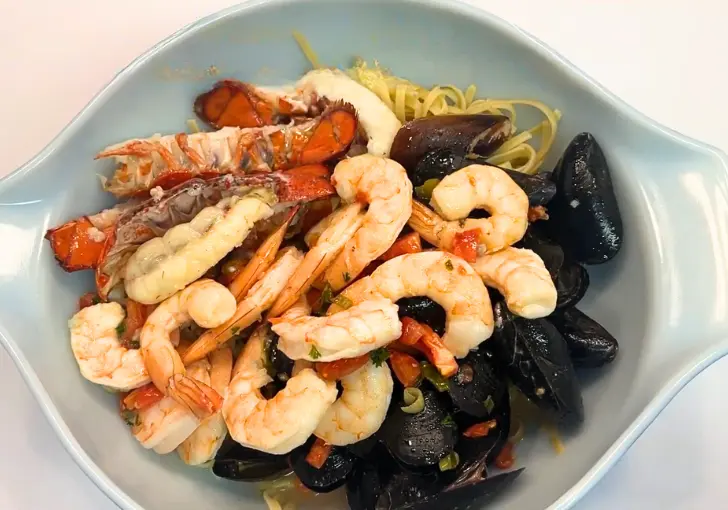 - Taste and adjust with additional salt, pepper, or white wine if needed. Serve immediately while hot, ensuring each portion contains pasta, shrimp, scallops, mussels, and lobster tail.