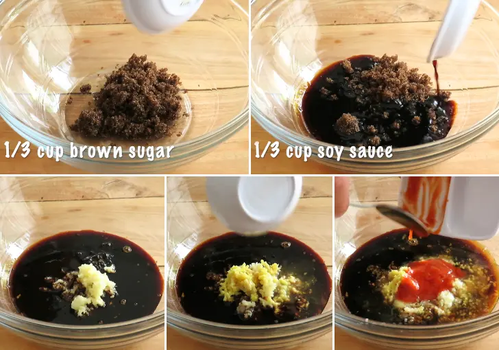 In a medium mixing bowl, whisk together brown sugar, soy sauce, ketchup, water, garlic paste, ginger paste, rice (or white) vinegar, and Sriracha. Whisk long enough for the brown sugar to dissolve completely—this prevents gritty uneven caramelization on the grill.