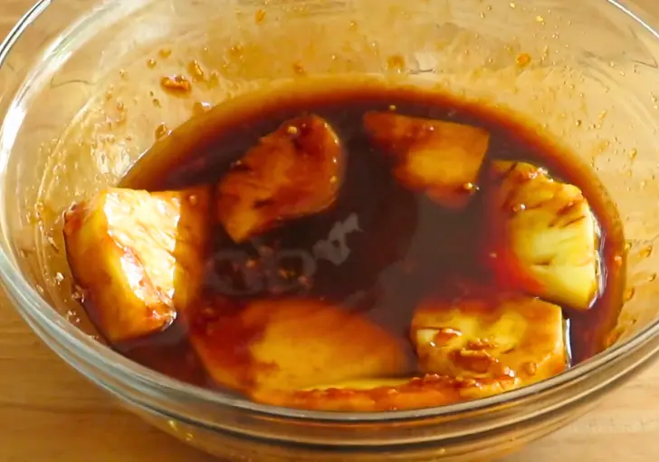 - In a bowl, add brown suger, soya sauce, garlic paste, ginger paste, sriracha hot sauce, rice vinegar/white vinger, ketchup, very little water and mix then well. Then add few pineapple chunks into the marinade and mix very well so that those chunks can suck in. Reserve 1/4 cup of the marinade for basting.