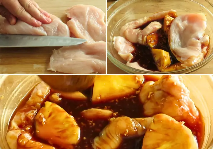 - Slice 2 chiken breasts in half like I did. Then place those sliced chicken breasts in the marinade and mix them well. Cover and refrigerate for 2hrs or more. You can keep it over night as well this will even taste better.