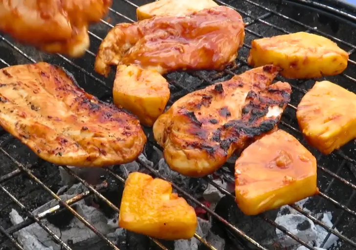 - Prepare your griller and grill those soaked sliced chicken breasts and pineapple chunks for about 7-8 minutes per side. Meanwhile, baste chicken with reserve sauce that we have from the 1st step. keep grilling untill both sides are well done.