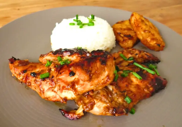 Jasmine rice works best because it’s soft, fragrant, and soaks up the glaze nicely. It’s light enough to let the chicken shine yet flavorful enough to make the whole dish feel like a classic island-style plate.